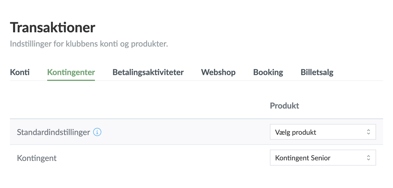- Gå herefter til fanerne Kontingenter, Betalingsaktiviteter, Webshop, Booking og Billetsalg, og tilknyt de produkter, du tidligere har oprettet, til de relevante opkrævninger.