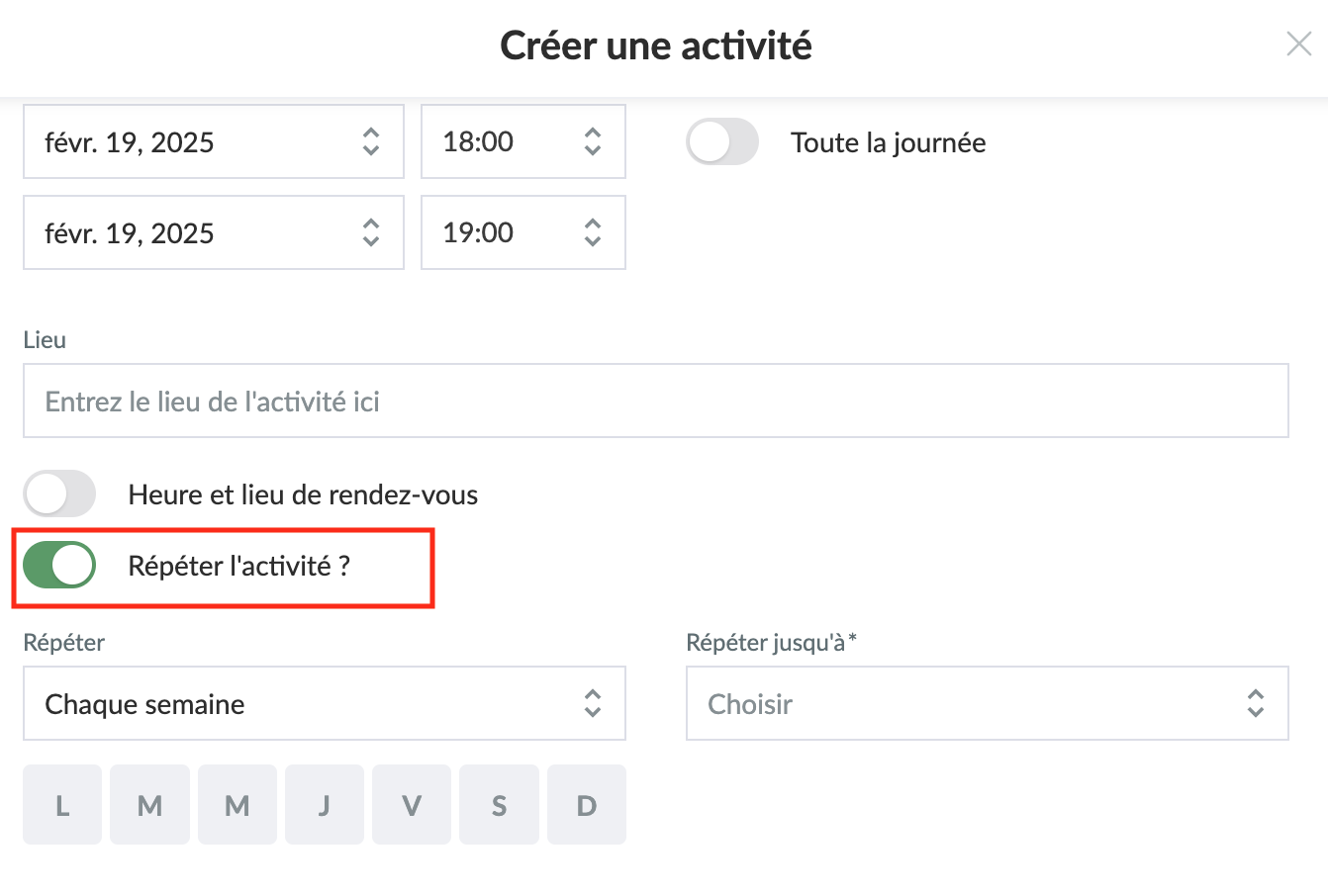 REMARQUE : Vous DEVEZ sélectionner la date pour laquelle l'activité doit être répétée, sinon la fonction ne fonctionnera pas.